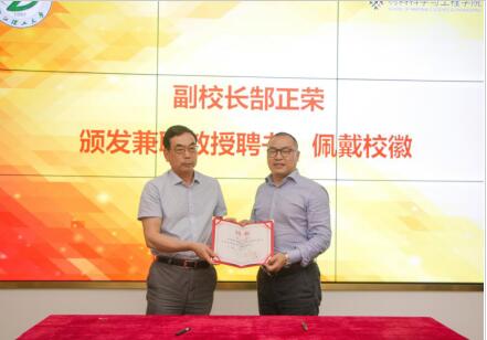 随后,副校长郜正荣为浙江联洋新材料股份有限公司董事长蔡正杰颁发兼职教授聘书并佩戴校徽。材料科学与工程学院党委委员周照东介绍浙江联洋新材料股份有限公司陈国锋、王雪兴、魏莉丽、张玉明、胡菊明等五人简历。校党委委员、材料科学与工程学院院长姚菊明为他们颁发学院兼职教授聘书、佩戴校徽。