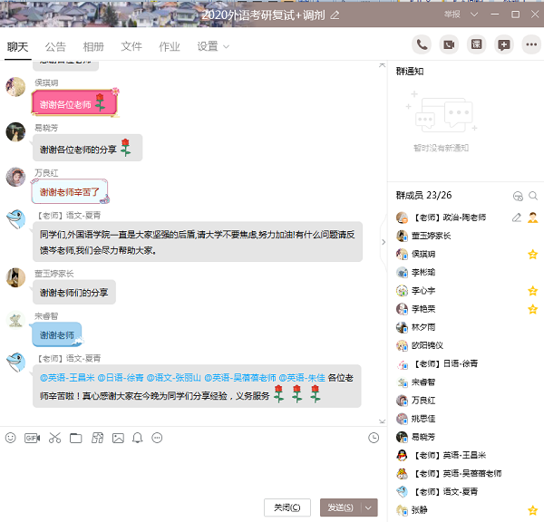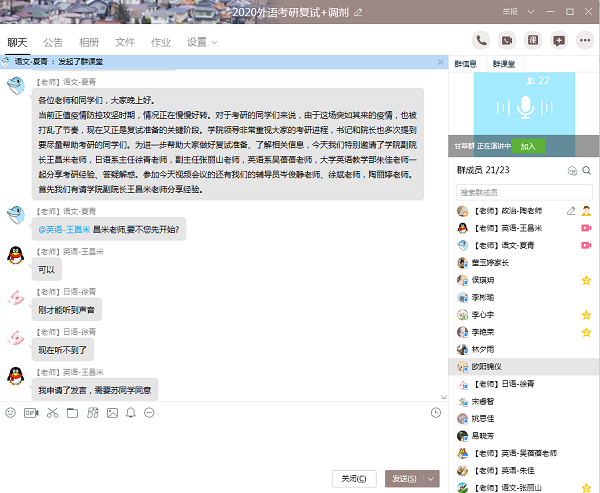 为进一步帮助考研学子做好复试准备、了解相关信息,解答疑问,3月19日晚19:00,外国语学院举行2020届毕业生考研复试分享会。此次分享会正值疫情特殊时期,通过QQ群课堂的直播方式进行。会议特别邀请了学院副院长王昌米、日语系主任徐青、日语系副主任张丽山、英语系吴蓓蓓、大学英语教学一部朱佳等老师一起分享考研经验、答疑解惑。参加直播分享会的还有学工办主任岑俊静、辅导员徐斌、陶丽婷等老师。会议由院党委副书记夏青老师主持。
