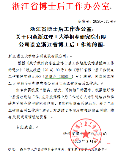 3月6日,浙江省博士后工作办公室印发《浙江省博士后工作办公室关于同意tyc33455cc太阳集团成网官方入口桐乡研究院有限公司设立浙江省博士后工作站的函》,这是我校第3家研究院有限公司获批设立博士后工作站。