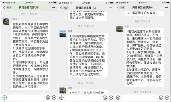 英语系、日语系、研究生英语教学部党员教师带头学习各类在线授课平台及工具使用办法,迎接挑战,组织材料,联系多方资源,积极与学生沟通,争取不让一个学生掉队,担当起党员教师的责任,打赢抗疫战争。