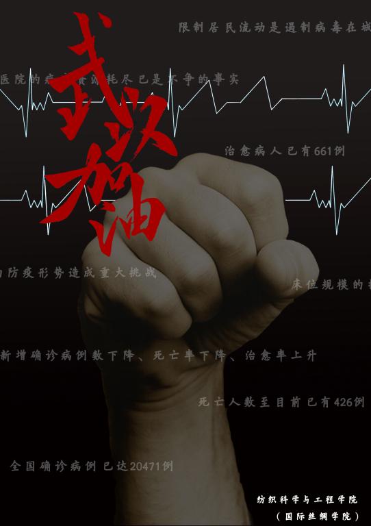 王能喆,19级丝绸设计与工程专业学生;楼佳浩,19级丝绸设计与工程专业学生;崔晓,19级纺织类专业5班学生;刘瑞琦,19级纺织类专业4班学生。在寒假疫情防控期间,四位团员结合自身特长,通过绘画的形式制作了四张海报,通过海报的形式为武汉加油打气,为在一线工作的医护人员奉献了自己的爱心,与他们共抗疫情,攻克时艰。