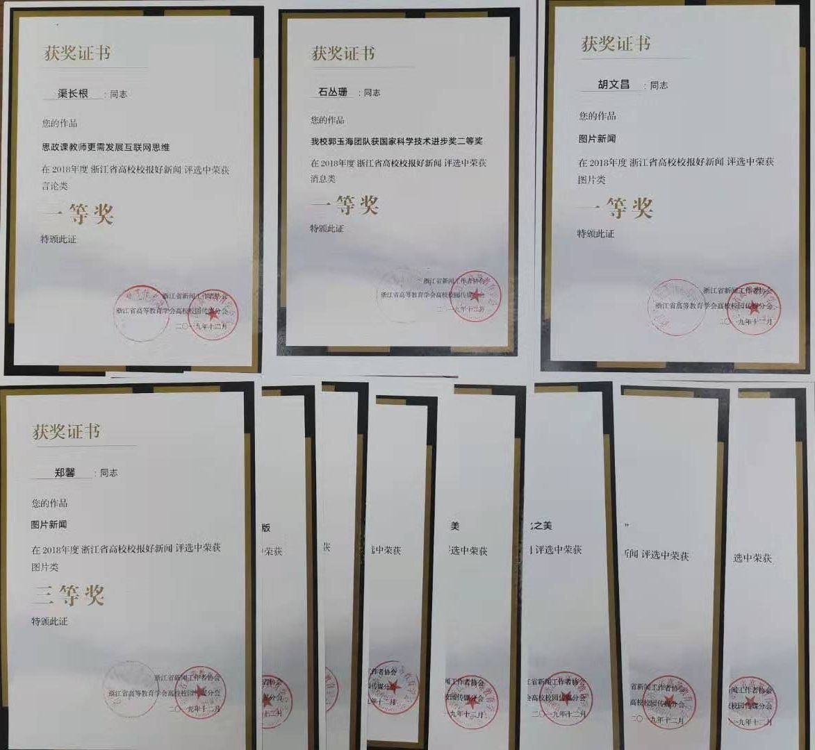 12月18日至20日,浙江省高等教育学会高校校园传媒分会在浙江海洋大学举行。浙江在线、省内高校相关领导,各高校宣传部长、新闻编辑部主任、校报编辑等130余人参会。会上进行的浙江省高校校报好新闻评选中,我校选送的8件作品分别获得了三个一等奖、五个三等奖的好成绩,其中渠长根老师的“思政课教师更需要发展互联网思维”荣获言论类一等奖,石丛珊老师的“我校郭玉海团队获国家科学技术进步奖二等奖”荣获消息类一等奖,胡文昌老师的图片新闻获图片类一等奖,一等奖奖项数创历年新高。