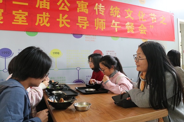 在寝室成长导师午餐会用餐其间,导师们关切地询问同学们的学习生活和日常饮食起居,并耐心为同学们解答生活和学习上的困惑与难题,还不时地用幽默风趣的语言现身说法,鼓励同学们克服学习生活上的困难,更好地投入大学生活。同学们也对导师敞开心扉,或倾诉自己的烦恼,或分享经历的大学趣事。双方相谈甚欢,餐桌上欢声笑语不断。