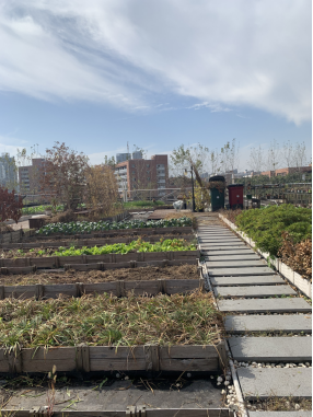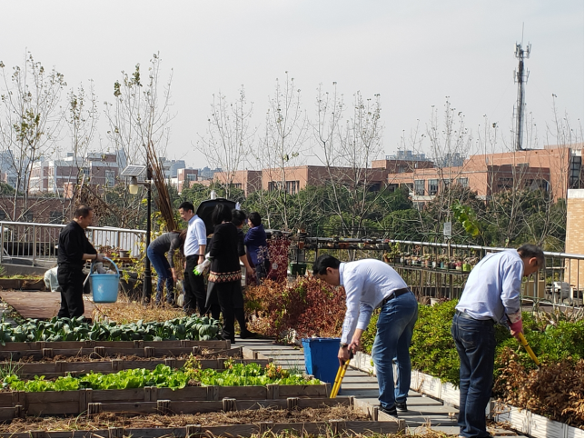 11月1日中午,艺术与设计学院行政办教工党支部联合学院党政班子成员利用午休时间来到21号楼顶能量花园开展“不忘初心、公共文化空间维护”志愿服务活动。参加活动的同志们清理了场地中纸板、塑料瓶、杂草等垃圾,对花园中的绿植进行了修剪、除草等维护管理。