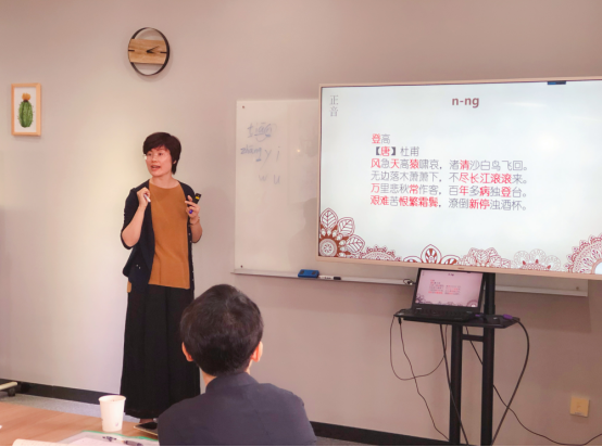 陈爱锋从语音、词汇、语法及汉字四个方面给大家讲解示范了普通话的朗诵要素。活动中鼓励现场教师积极参与普通话词汇与诗句的朗读,通过实操的方式加快大家对朗诵技巧的把握,活动气氛热烈,教师们纷纷表示,此次推普沙龙活动让自己深切地认识到作为一个教育工作者,说好普通话,写好规范字是一项基本但又及其重要的技能。