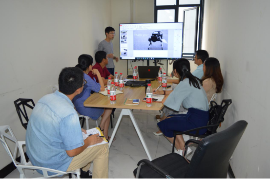 首先,在王兴兴校友的陪同下,潘海鹏一行参观了公司的研发部门及公司备受关注的Laikago四足机器人“网红产品”。王兴兴介绍,这款四足机器人具有强劲的动力性能和运动稳定性。Laikago整机有12个高性能电机,总瞬时最大功率为18KW,功率质量密度0.8KW/Kg,已经可以实现基本上下坡草地、简单的平衡功能并保证运动的稳定性。王兴兴通过设计电机、驱动器及整套控制系统和部分传感器,大大提高了机器人集成度。保证它能在复杂情况下都有保持良好的稳定性。当提到为什么从大疆离职投身创业时。王兴兴谈到因为自己从小就喜欢科技,在研究生期间独立设计的XDog正好被国内外媒体广泛报道,于是就在2016年8月离职,创立了宇树科技。之后从尺寸、体型、动力性能规划出发,按设计需求全新独立研发了电机、电动驱动及主控、整机机械结构以及全新重构的控制系统,打造了全新的四足机器人“Laikago”。