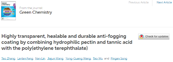 8月30日,我校艺术与设计学院视觉传达设计系张涛博士和澳大利亚南昆士兰大学、浙江农林大学、苏州大学合作团队在《Green Chemistry》上发表题为“Highly transparent, healable and durable anti-fogging coating by combining hydrophilic pectin and tannic acid with the poly(ethylene terephthalate)”的最新研究成果。该工作探索了高分子材料与艺术设计的结合点,研究了水雾和冰雾环境下视觉信息的传递机制。张涛博士为论文的第一作者和第一通讯作者,tyc33455cc太阳集团成网官方入口为第一完成单位。