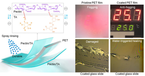 鉴于此,研究团队选用天然无毒的食品级材料果胶(pectin)和单宁酸(tannic acid,TA),采用浸涂法(dip-coating)在聚对苯二甲酸乙二醇酯薄膜(poly(ethylene terephthalate),PET)表面构建了高分子复合材料涂层。该涂层在沸腾的开水上面和-20℃下的冰箱中均显示优异的防雾性能,在表面受到外力划伤时具有较快的自愈合能力,同时在高速水流冲刷和酸碱溶液浸泡时也显示较好的稳定性。该涂层适应的基体广泛,且制备方法简便,为防雾材料的研究开发提供了有益参考。