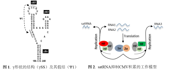 研究发现CMV satRNAT1分离物(sat-T1)能减轻CMV在本氏烟植物上引起的病毒症状,并选择性地降低编码病毒复制酶的CMV RNA1和RNA2的积累水平。反式复制实验结果表明sat-T1降低CMV RNA 1和RNA2的积累是由于sat-T1抑制CMVRNA1和RNA2复制的结果。他们通过RNA结构的预测和功能分析,测定复制竞争的结构基础是一个保守的三向分支结构,命名为γ形状的结构(γ-shapedstructure,γSS)(图1)。该结构包括2个具有生物学意义的发夹结构(γH1和γH2),γH2是复制竞争所必需的,γH1参与对sat-T1生存至关重要的假结结构的形成。基于研究结果的讨论,他们推测satRNA通过γSS结构与辅助病毒RNA1和RNA2竞争复制所需的宿主因子,从而抑制CMV的积累和症状表达 (图2)。