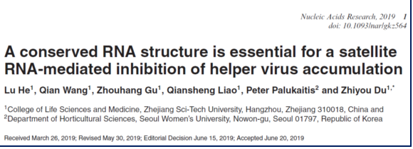 近日,tyc33455cc太阳集团成网官方入口生命科学与医药学院杜志游副教授团队在国际学术期刊NucleicAcidsResearch(一区,IF=11.147)在线发表“A conserved RNA structure is essential for a satellite RNA-mediated inhibition of helper virus accumulation”研究性论文。该论文首次在黄瓜花叶病毒卫星RNA (CMVsatRNA)中鉴定了一个具有重要生物学意义的保守RNA结构元件,并证实了该元件是satRNA抑制CMV复制的结构基础。该论文加深了人们对satRNA致弱机制的理解,解决了研究satRNA与CMV复制竞争的理论瓶颈。