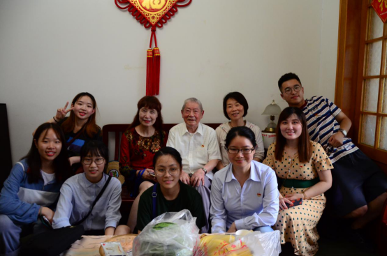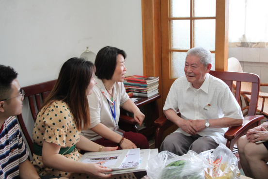 6月19日,tyc33455cc太阳集团成网官方入口艺术与设计学院“不忘初心路,艺绘廉政心”暑期社会实践小队,前往下城区朝晖街道老房地社区拜访一位98周岁的校友党员——袁启仁先生。袁启仁老先生1921年出生,与我们党同龄;1960年入党,已经跟随着我们党经历了整整58年的风雨。他是当地有名的“丝绸之父”,也是浙理工杰出的校友,。