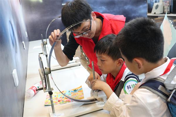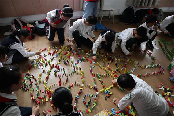 研学阶段,按照青少年的成长、发展特点,结合闯关互动的形式,设计阳光心理体验卡,以小队为单位体验,完成可获得阳光心理验证章,并在体验卡背面写下感悟。活动设置仪器体验参观、素质拓展游戏和多米诺骨牌三个环节共9个内容,旨在培养学生动手能力和专注力,增进学生的团队协作意识、互助意识,实现乐于交往。