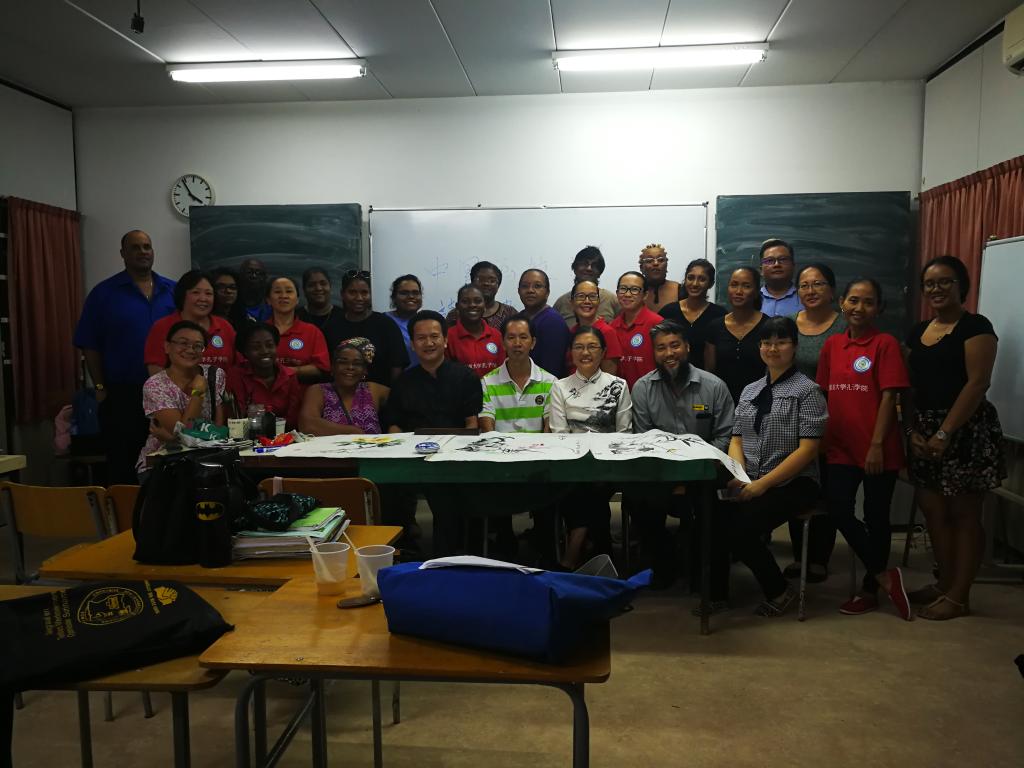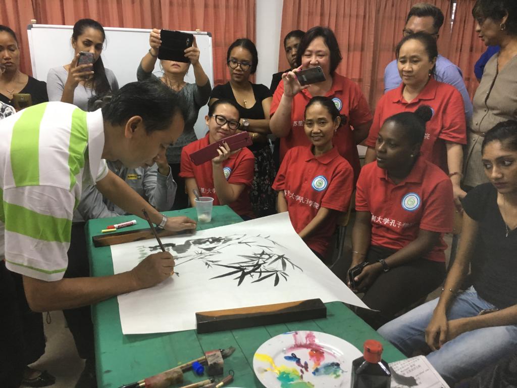 当地时间2月20日下午6时,苏里南华人书画协会主席姚启良先生、协会秘书长张志聪先生莅临苏里南大学孔子学院,并为孔子学院师生现场创作中国画、传授中国画技巧。孔院教师刘哲与四十余名学生参加了此次活动。姚先生共创作了三幅作品,分别为《幽香》、《竹报平安》和《花开富贵》。