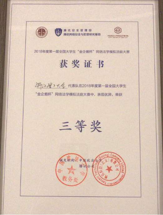 11月3日至4日,法政学院模拟法院代表队应邀赴中国政法大学参加首届全国大学生“金企鹅杯”网络法学模拟法庭大赛。本次赛事由中国政法大学和腾讯公司联合主办,有24所高校队伍参赛。我院参赛队伍由王健院长牵头,陈学辉和秦红嫚两位老师指导,邵冰茜、常庆茜、马欣怡、周长婷、李畅、徐向等同学组成。备赛阶段,学院还邀请了浙江六和律师事务所的田暐律师、杭州市江干区人民法院的沈亚青庭长、杭州市临安区人民检察院的夏立强检察官、温州瑞安市人民检察院的胡凯检察官以及郑旭江老师进行了悉心指导。