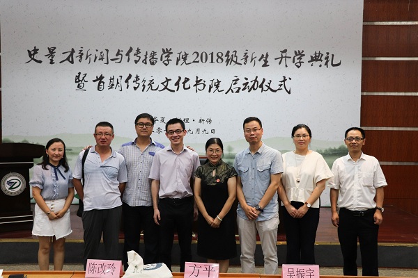 9月9日晚,史量才新闻与传播学院举行2018级新生开学典礼暨首期传统文化书院启动仪式在行政楼二楼报告厅举行,学院党总支书记陈改玲,副书记方平,11届校友、浙江日报政治新闻部记者吴振宇,以及各系主任、教师代表和新生班主任、辅导员出席典礼。方平主持典礼活动。