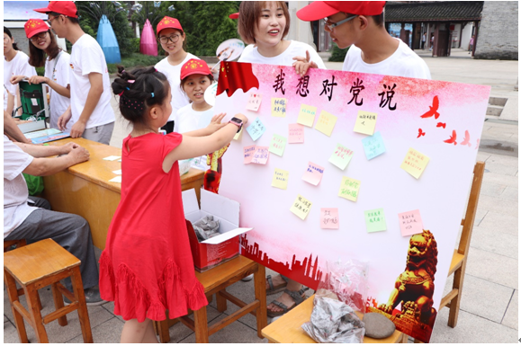 正值中国共产党成立97周年之际,实践队开展了“我想对党说”主题留言活动,邀请居民们在便签纸上写下对党的期许和祝福,得到了居民们的积极响应。研究生党员们也以此为契机,在历史悠久的南关厢社区前举行了重温入党誓词的活动。党员们面向鲜红的党旗,严肃而庄重地念出对党的承诺,表达了奉献的决心。