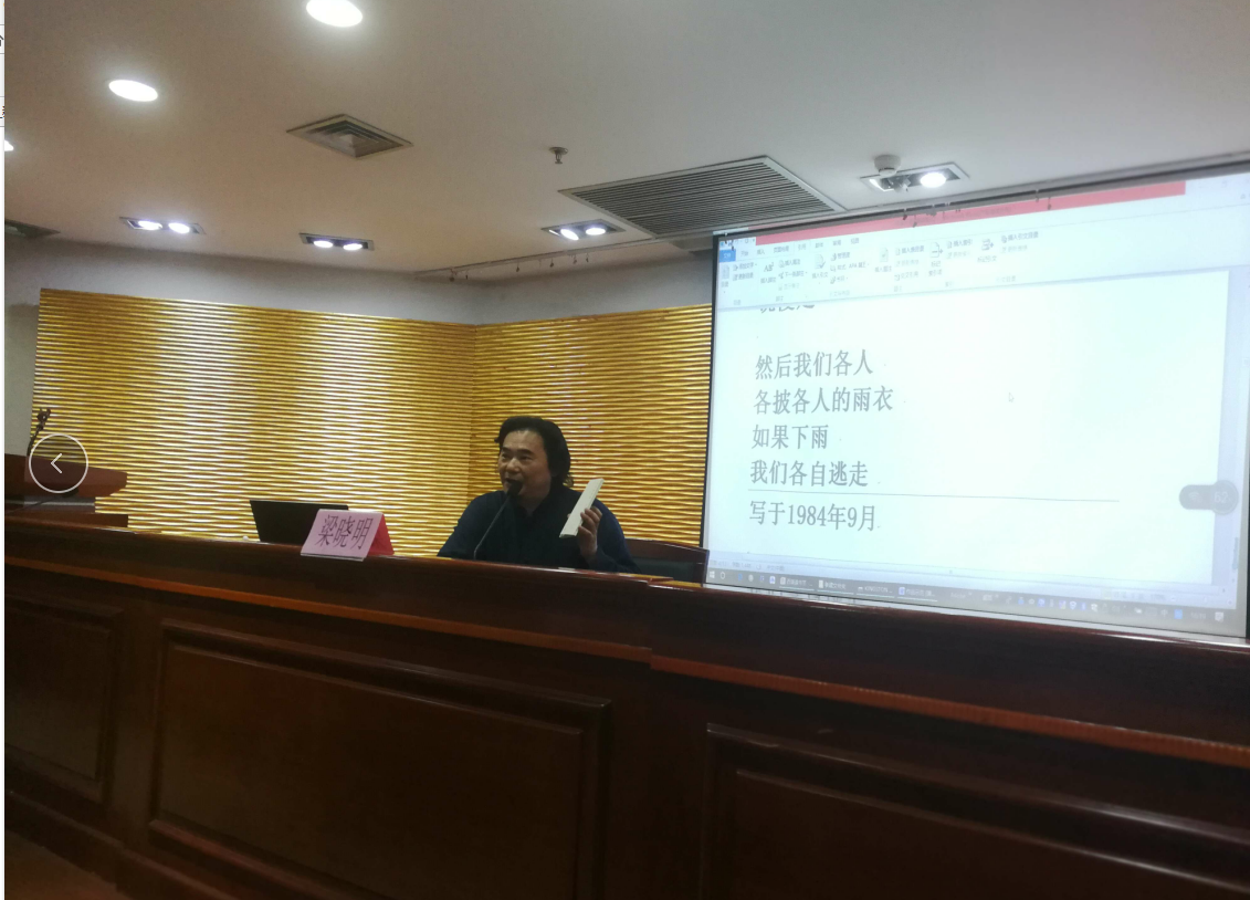 期间,梁晓明从现代诗歌的创意出发,谈了诗歌的创作技巧以及自己在现代诗歌方面所进行的探索和感悟。现场梁晓明还分享了自己的作品和音乐作品,他指出,诗歌创作讲求长期的阅读积累和不间断的写作锻炼,青年学生要从成长成才的基点切入,用诗歌来体验生活,用文化装点生活,不断夯实自身成长成才的土壤,进而开花结果。