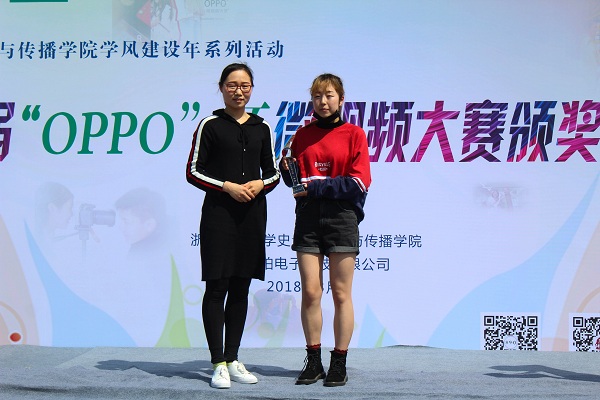 3月28日,作为新传学院2018年学风建设年系列活动之首届“OPPO”杯微视频大赛颁奖典礼在学活广场正式举行。学院党总支书记陈改玲、副书记方平,院长助理单宝顺,教师代表蒋晓娜以及杭州江珀电子科技有限公司推广部经理曲艳霞出席了本次颁奖典礼。本次微视频大赛由杭州江珀电子科技有限公司赞助,经过为期3个月之久的作品选拔,共计30余件作品入围,经评审19件作品获得殊荣。