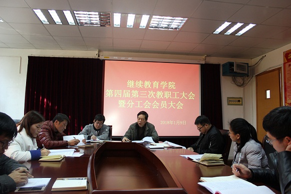 1月9日上午,继续教育学院四届三次教职工大会暨工会会员大会在文一校区301会议室举行,会议由学院党总支书记姚春序主持,学院全体教职工参加会议。