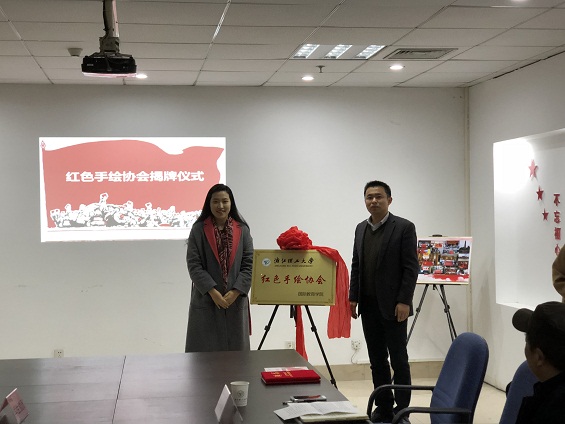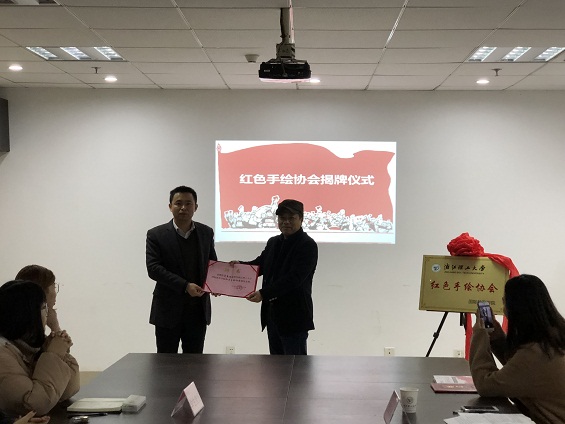 吕媛媛和吴跃峰共同为红色手绘协会揭牌,吴跃峰为协会指导教师渠长根颁发聘书,卢跃华为红色手绘协会会长俞晴颁发聘书。
