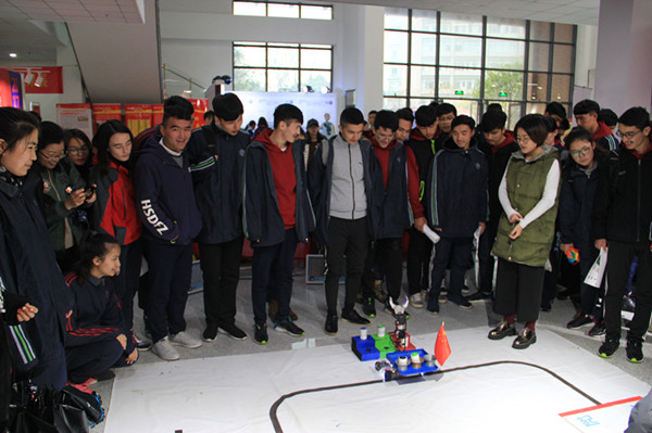 本次参观分为金工中心和科技作品展两部分。来访师生首先来到金工中心,由杨金林老师对线切割、数控机床等大型机器进行讲解,同学们对于自动化加工表现出了浓厚的兴趣。随后参观了实验大楼的科技作品展,包括无人机、智能小车、机器人等大学生科技作品,由国家奖学金获得者朱超宁等优秀大学生进行现场演示,来访师生对现场模拟赞叹不已。现场学生也不断地向机控学子提问,经过双方互动讨论,同学们对机控学院专业和生活有了进一步了解。
