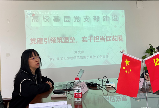 理学院物理学系教工党支部书记刘爱萍以《党建引领筑堡垒,实干担当促发展》为题做专题分享。她首先从学科发展、人才队伍、特色研究方向和教学科研平台等方面介绍了物理学系的基本情况,重点围绕物理学系教工党支部“样板党支部”和“双带头人”教师党支部书记工作室的创建成果和经验,从总体思路、建设目标、建设方案和建设成效等进行了生动详细的分享。