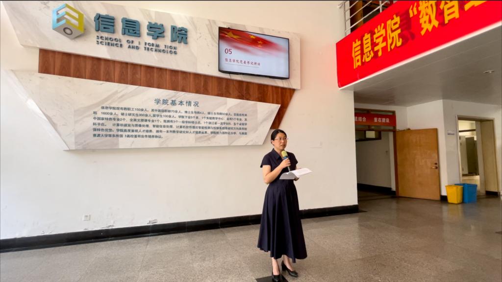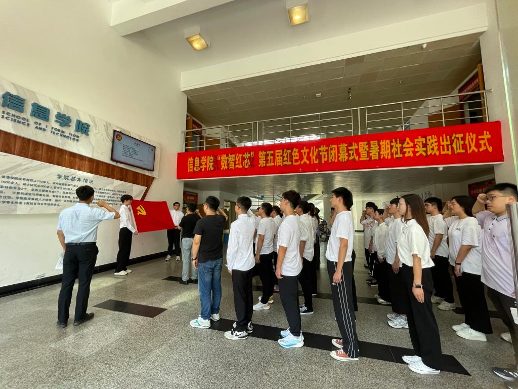 在省第十五次党代会胜利闭幕、七一即将到来之际,为深入学习贯彻党的十九届六中全会精神,巩固拓展党史学习教育成果,喜迎党的二十大胜利召开,有力营造红色文化育人氛围,6月23日下午,我院在一楼大厅举行了“数智红芯”第五届红色文化节闭幕式暨暑期社会实践出征仪式。党委书记黄黎,党委副书记丁宁,党委委员朱诗威出席活动,师生党员代表,新发展学生党员以及暑期社会实践团队代表等参加了本次活动。