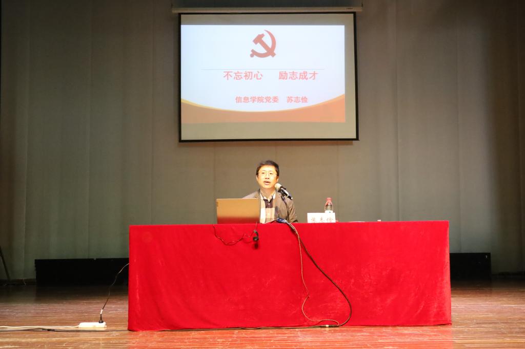 仪式结束后,苏志俭作以“不忘初心,励志成才”为题的专题党课。他结合生动形象的事例从为什么要上党课学理论、为什么要开展“不忘初心、牢记使命”主题教育活动、为什么要有“四个自信”三个方面向党校成员阐述中国共产党的初心和使命。他还勉励党校成员要坚定理想信念,加强品德修养,增长知识见识,培养奋斗精神,利用好“教室、寝室、实验室、图书馆、操场”五个地方,立志成长为社会主义合格建设者和可靠接班人。