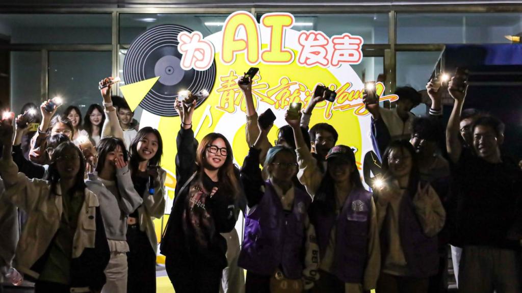 活动尾声,师生围成“青春小火车”随音乐欢舞,齐呼“为AI发声,青年就这Young”口号,并在主题墙前合影。活动以露天互动形式将科技与情怀结合,为校园文化注入活力,激励学子以创新担当践行时代使命。