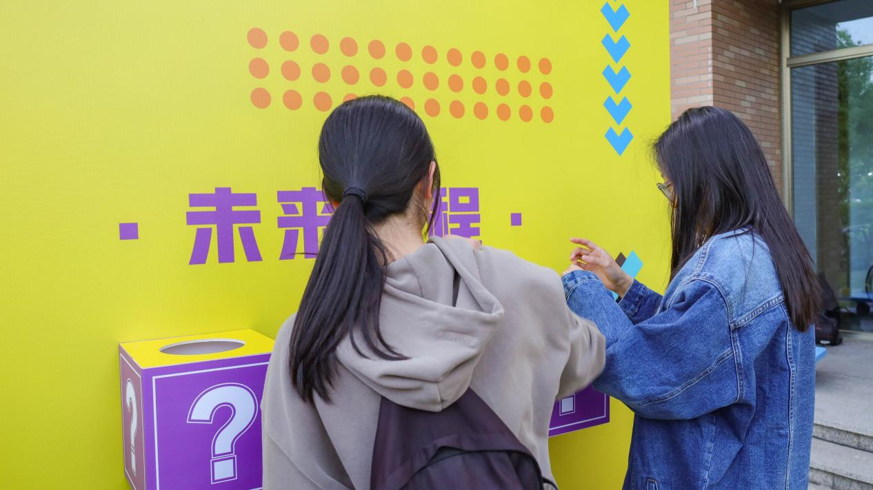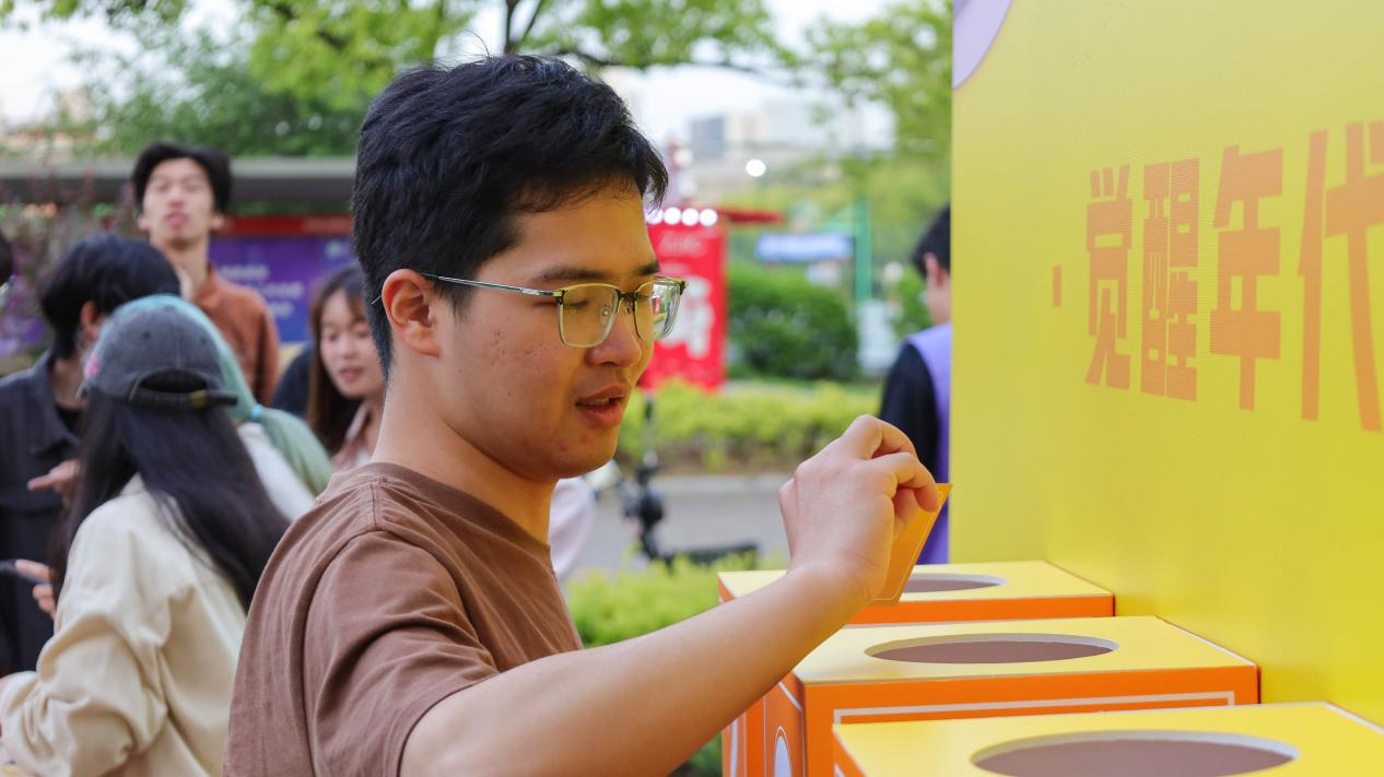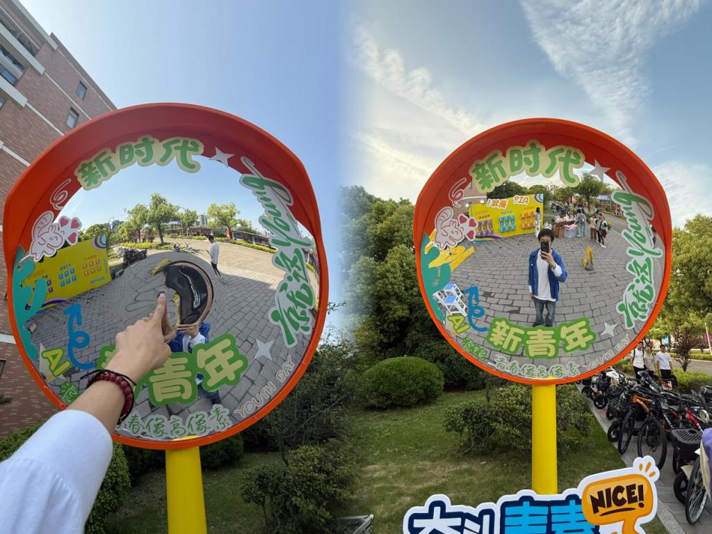 拍照打卡区以“五四元素+科技美学”为主题,精心设计的凸面镜成为热门打卡点。镜面印有“AI青年”、“新时代”等元素,参与者可通过镜面变形特效拍摄趣味照片,现场欢声笑语不断。