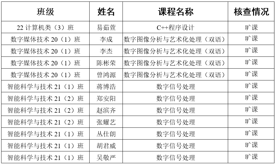第11周至第12周我院学生工作办公室和学风建设指导中心会学习部对学生课堂出勤情况和学习表现进行了随机抽查,现将抽查结果通报如下: