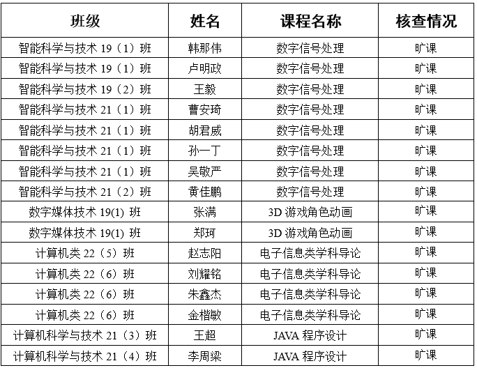 第4周至第5周我院学生工作办公室和学风建设指导中心会学习部对学生课堂出勤情况和学习表现进行了随机抽查,现将抽查结果通报如下: