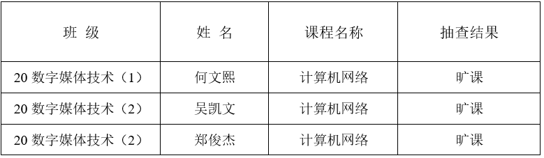 第4周至第6周我院学生工作办公室和学风建设指导中心会学习部对学生课堂出勤情况和学习表现进行了随机抽查,现将抽查结果通报如下。