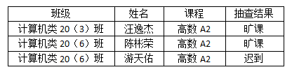 第10周我院学生工作办公室和学风建设指导中心会学习部对学生课堂出勤情况和学习表现进行了随机抽查,现将抽查结果通报如下。