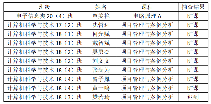 第9周我院学生工作办公室和学风建设指导中心会学习部对学生课堂出勤情况和学习表现进行了随机抽查,现将抽查结果通报如下。