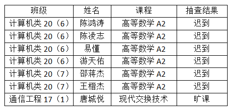 第2周我院学生工作办公室和学风建设指导中心会学习部对学生课堂出勤情况和学习表现进行了随机抽查,现将抽查结果通报如下。