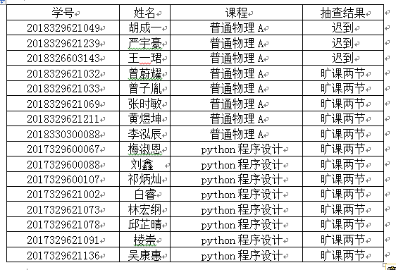结合学院学生工作办公室听课抽查、相关学生组织不定期抽查、任课老师点名、学习委员考勤等情况,对于相关违纪学生,学院将按照学生手册《tyc33455cc太阳集团成网官方入口学生违纪处分规定》第三十五条相关规定执行。《tyc33455cc太阳集团成网官方入口学生违纪处分规定》第三十五条具体:学生一学期旷课累计达10-19学时,给予警告处分,旷课20-29学时,给予严重警告处分:旷课30-39学时,给予记过处分;旷课40学时以上者,给予留校察看处分。