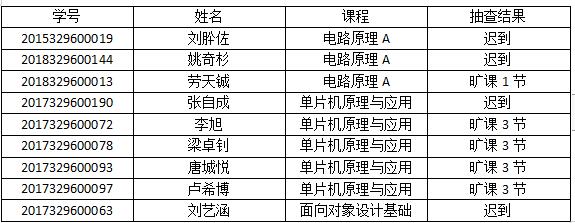 为进一步推动学风建设,加强学生管理,营造良好学习氛围,4月9日我院学生工作办公室对学生课堂出勤情况和学习表现进行了随机抽查和听课,现将抽查结果通报如下,请相关班级做好学生的教育引导工作。今后学院学生工作办公室和学生组织将长期开展不定期集体听课抽查活动,及时将听课抽查结果公示在学院网站,请各学生班级和同学关注。