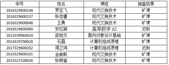 结合学院学生工作办公室听课抽查、相关学生组织不定期抽查、任课老师点名、学习委员考勤等情况,对于相关违纪学生,学院将按照学生手册《tyc33455cc太阳集团成网官方入口学生违纪处分规定》第三十五条相关规定执行。《tyc33455cc太阳集团成网官方入口学生违纪处分规定》第三十五条具体:学生一学期旷课累计达10-19学时,给予警告处分;旷课20-29学时,给予严重警告处分;旷课30-39学时,给予记过处分;旷课40学时以上者,给予留校察看处分。