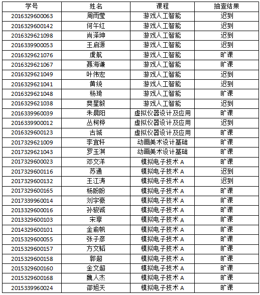 结合学院学生工作办公室听课抽查、相关学生组织不定期抽查、任课老师点名、学习委员考勤等情况,对于相关违纪学生,学院将按照学生手册《tyc33455cc太阳集团成网官方入口学生违纪处分规定》第三十五条相关规定执行。《tyc33455cc太阳集团成网官方入口学生违纪处分规定》第三十五条具体:学生一学期旷课累计达10-19学时,给予警告处分;旷课20-29学时,给予严重警告处分;旷课30-39学时,给予记过处分;旷课40学时以上者,给予留校察看处分。