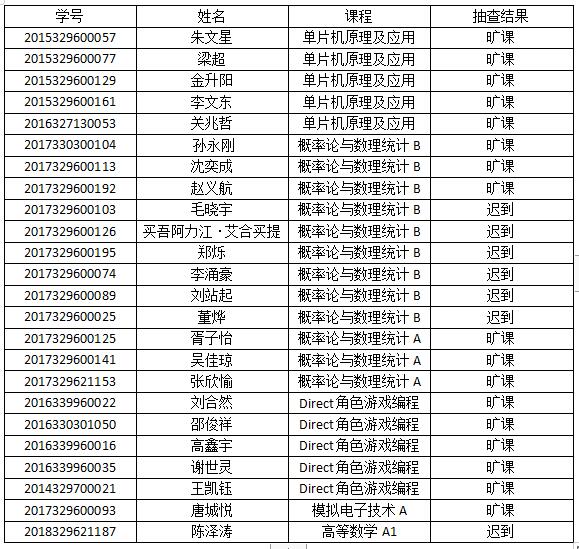 结合学院学生工作办公室听课抽查、相关学生组织不定期抽查、任课老师点名、学习委员考勤等情况,对于相关违纪学生,学院将按照学生手册《tyc33455cc太阳集团成网官方入口学生违纪处分规定》第三十五条相关规定执行。《tyc33455cc太阳集团成网官方入口学生违纪处分规定》第三十五条具体:学生一学期旷课累计达10-19学时,给予警告处分;旷课20-29学时,给予严重警告处分;旷课30-39学时,给予记过处分;旷课40学时以上者,给予留校察看处分。