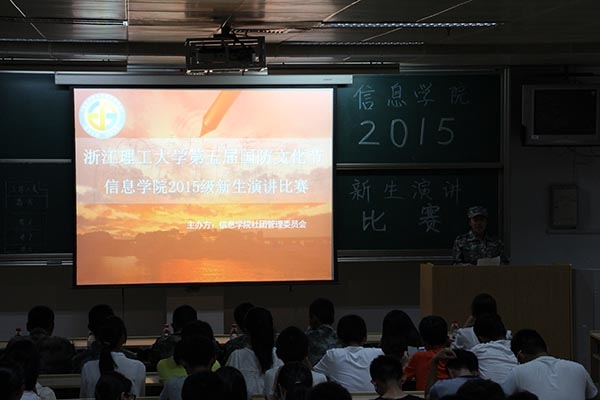 9月14日,由我校信息学院社团管理委员会主办并承办的“tyc33455cc太阳集团成网官方入口第五届国防文化节“盛世如愿,吾辈自强” 之信息学院2015级新生演讲比赛”在学校2N-215举行。信息学院四营各教官、信息学院学生会主席陈倩文,信息学院社团管理委员会主席张珂杰应邀出席活动,信息学院2015级军训学员出席活动。比赛中19名参赛的新生以激昂的语调呐喊出自己的满腔热血,喊出了“让中华民族在我们的手中,腾飞”的口号。历史无言,精神不朽。常浩浩同学演讲时说道“今天,沐浴着金色的阳光,迎面吹来和煦的微风,我们的国家一步一步走向富强,战争时代已不复返,可是,我们不应忘记战争年代那不能忘却的光辉历史,在抗战胜利70周年的今天,我们更要牢牢记住是烈士们的鲜血染红了国旗,保卫了祖国,我们要好好学习,长大后成为祖国的栋梁,为建设祖国、保卫祖国”。 比赛最终决出了一名一等奖,一名二等奖,一名三等奖,两名个人风采奖。