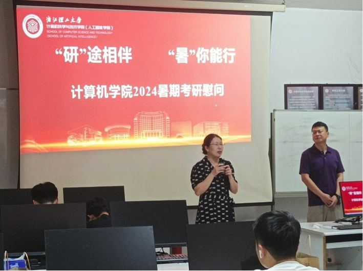 为进一步做好2024年暑假留校考研学生的服务保障等工作,鼓励我院考研学子以更加饱满的学习热情、更加高昂的斗志进行复习备考,8月8日下午,计算机科学与技术学院(人工智能学院)党委书记黄黎和党委副书记丁宁、21级辅导员李想前往学院暑期考研教室慰问暑期留校考研学生,为同学们加油鼓劲。