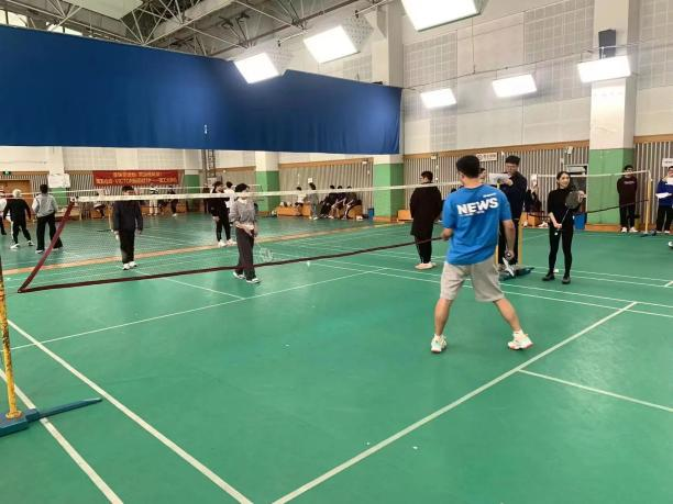 羽毛球比赛于11.26日下午13点30分在羽毛球馆正式打响,选手们经过一段时间的热身和拉伸后正式进入比赛。