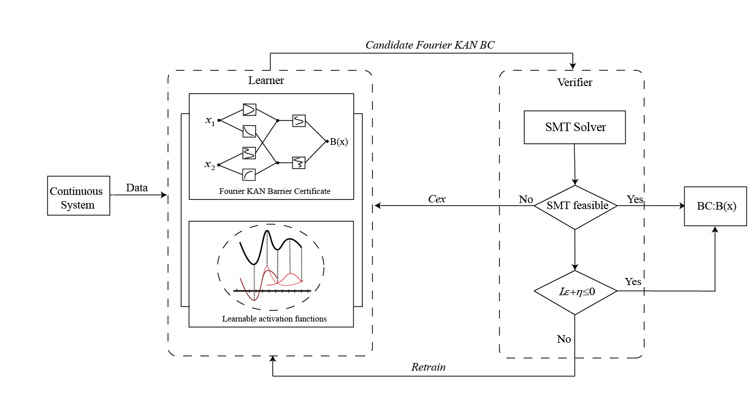 人工智能组件已被广泛应用于无人驾驶飞机、自主驾驶汽车等安全攸关系统。如何保障这些智能系统的安全可信,是当前国际学术领域面临的关键难题。本论文提出了一种基于Fourier KAN障碍证书的神经网络控制系统的安全性验证框架,利用FourierKAN增强了神经障碍证书的训练能力,并运用SMT求解和Lipschitz方法协同保证Fourier KAN障碍证书的正确性。该方法有效提升了神经障碍证书的构造效率和成功率,为智能系统的安全性保障提供了理论支撑。