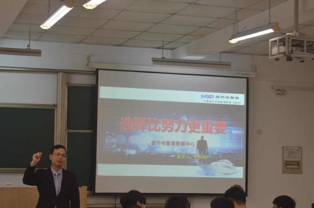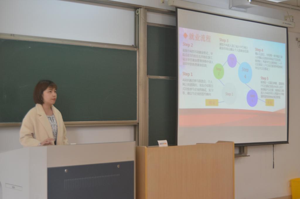 会议伊始,黄诗莹首先介绍了毕业后的几种选择(就业、考研、考公、出国、创业),着重讲述了就业流程及签约分类,接着讲解了报到证改派及户口改迁手续的注意事项,然后介绍了毕业生档案的相关事宜,最后她强调了毕业相关事宜重要的时间节点。随后,方水明上台,他告诉大家若要留在杭州,一定要抓住机会将户口改迁并且在毕业季之前找好房源,学生档案也必须要及时确认好,最后他跟同学们说道,无论何时,你身处何地也别忘了母校。最后,徐军海上台讲述了大数据的优势,并简单介绍了培训的相关内容,并表示愿意给毕业生提供帮助。