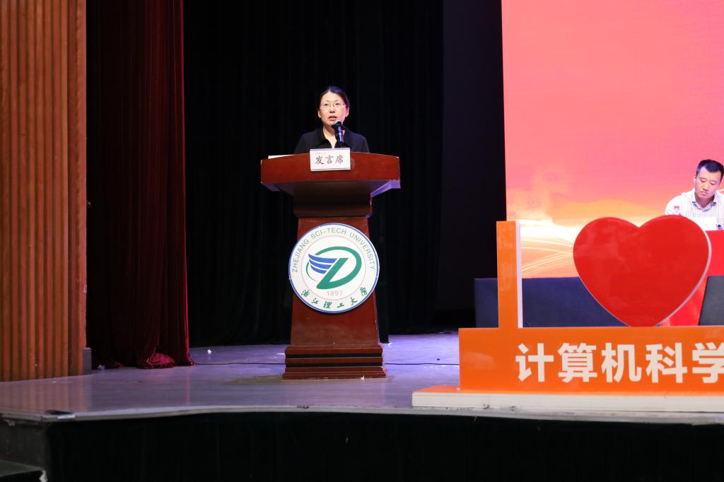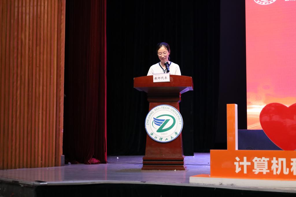 教师代表金蓉老师发言。她希望同学们能够充分发挥自身的特长,积极响应建设科技强国的号召,以持续创新的精神迎接专业知识的挑战。她鼓励大家勇于挑战自我,并养成良好的自主学习习惯,以达成个人更加卓越的成就。
