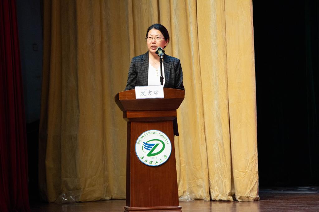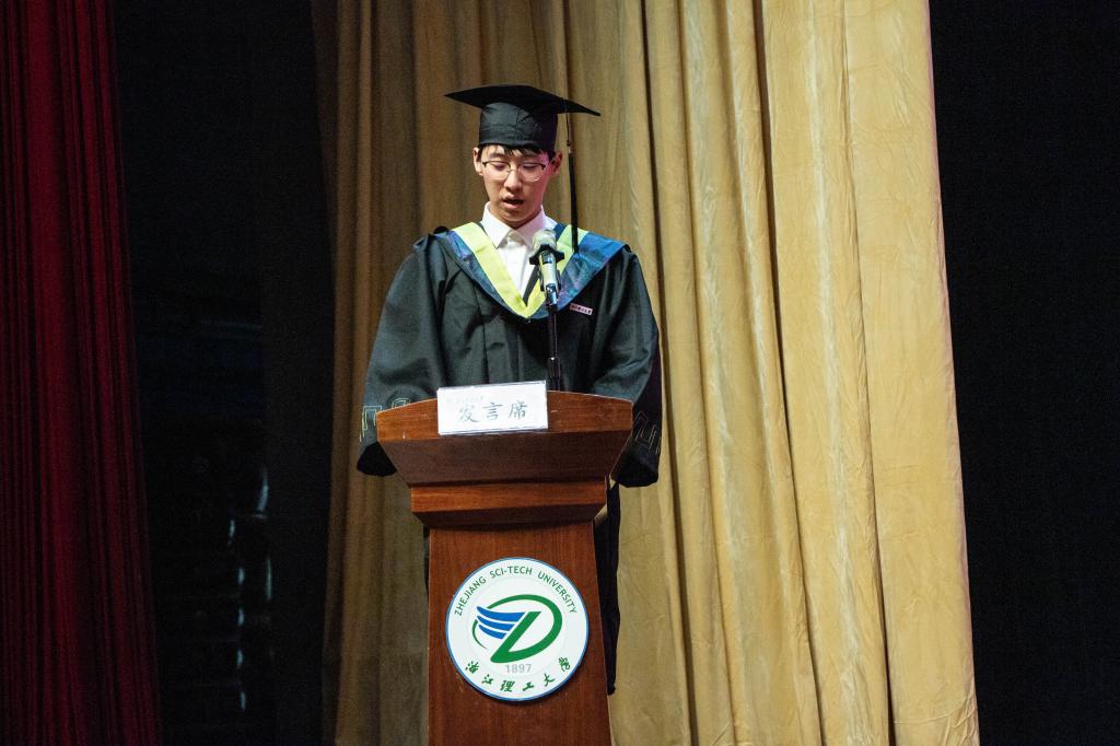 国家奖学金获得者、2023届毕业生代表蒋一杰,他向母校和学院、老师、亲友们表示了感谢,并号召毕业生们不负母校栽培,从浙理启航,为自己的目标和理想奋斗。