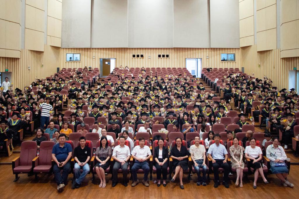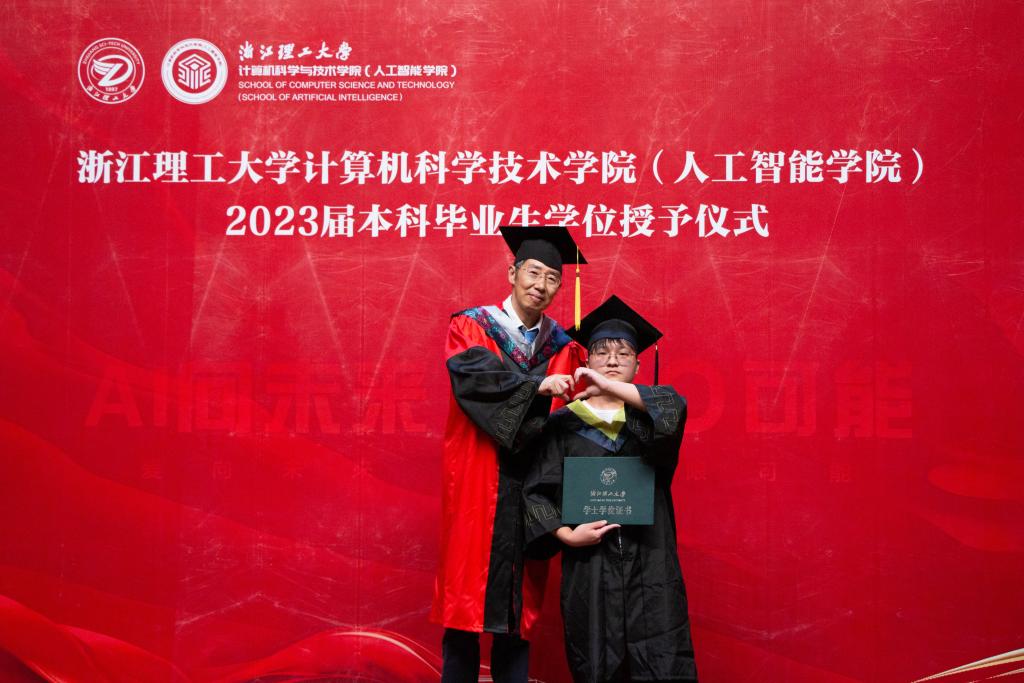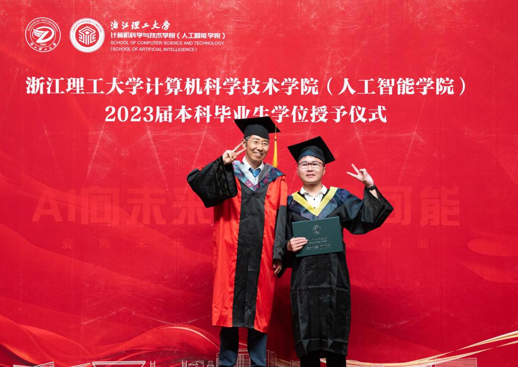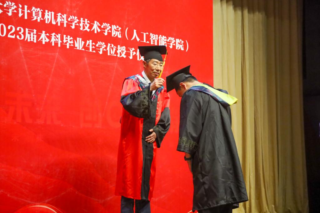 毕业典礼结束后,举行了2023届计算机科学与技术学院(人工智能学院)学士学位授予仪式,学院院长丁佐华为全体本科毕业生颁发学士学位证书,扶正流苏并合影留念。