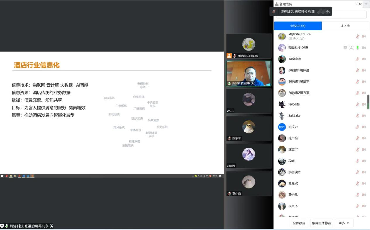 本次报告中,张总首先简要地介绍了公司的概况。辉驿科技是一家专注于连锁商业IT综合服务的互联网公司,凭借多年深耕酒店服务信息化行业的优势,成为了首旅如家、锦江集团等全国著名连锁酒店的重要服务运营商。张总从解读信息化的定义开始,让大家了解信息化涉及的技术、方法、目标和愿景。为了让学生们能场景式地学习,以辉驿科技所服务的酒店行业为背景开展了深入的剖析。涉及的产品技术从早期的WIFI无线门户、智能电视OTT门户、智能门锁,到后来的SD-WAN虚拟内网、自助入住系统、直至近期比较流行的送物机器人、智控客房平台等。张总介绍了每个产品的业务背景、对酒店信息化的价值以及所采用的技术方案。其中,他着重结合《计算机网络》课程,分析了软件定义网络SD-WAN技术在酒店服务行业信息化中的应用场景。SD-WAN项目涉及到SDN技术,链路实时检测,基于资源最优化的最佳路径选择等技术。随后,张总介绍了辉驿科技为酒店行业量身定制的智慧酒店运营中控平台,它集物联网数据采集,大数据分析,业务流标准配置、运营过程自主优化等功能于一体,通过自主学习,为酒店或酒店集团提供运营辅助及线索。介绍完酒店行业的信息化,张总将其类推于其他行业,阐述了信息化的5个类别及相互关系。最后,张总给同学们提出了学习的要求:在专业学习的同时,要经常抬起头看看现在社会信息化发展的状况,发现自己的优势和不足,面向期待从事的行业和领域,提前规划自己未来的学习和发展方向。立足当下,扎实学习,提高技能,为后续踏入信息化社会打下扎实的专业技术基础。